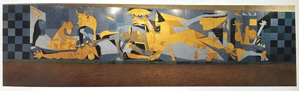 El primer problema es de proporciones. El Guernica real mide 3,50 x 7,82, pero siempre me ha parecido más largo. Por lo pronto se debe colocar la lámpara en el centro —no se puede, pues quedaría el bombillo cortado por la mitad. Primera equivocación: el bombillo quedó en el panel número 4 y debe estar en el 5. Aunque la lámpara no queda en el centro, es el centro de la composición; se asocia con las lámparas verdes del estudio y los bombillos.