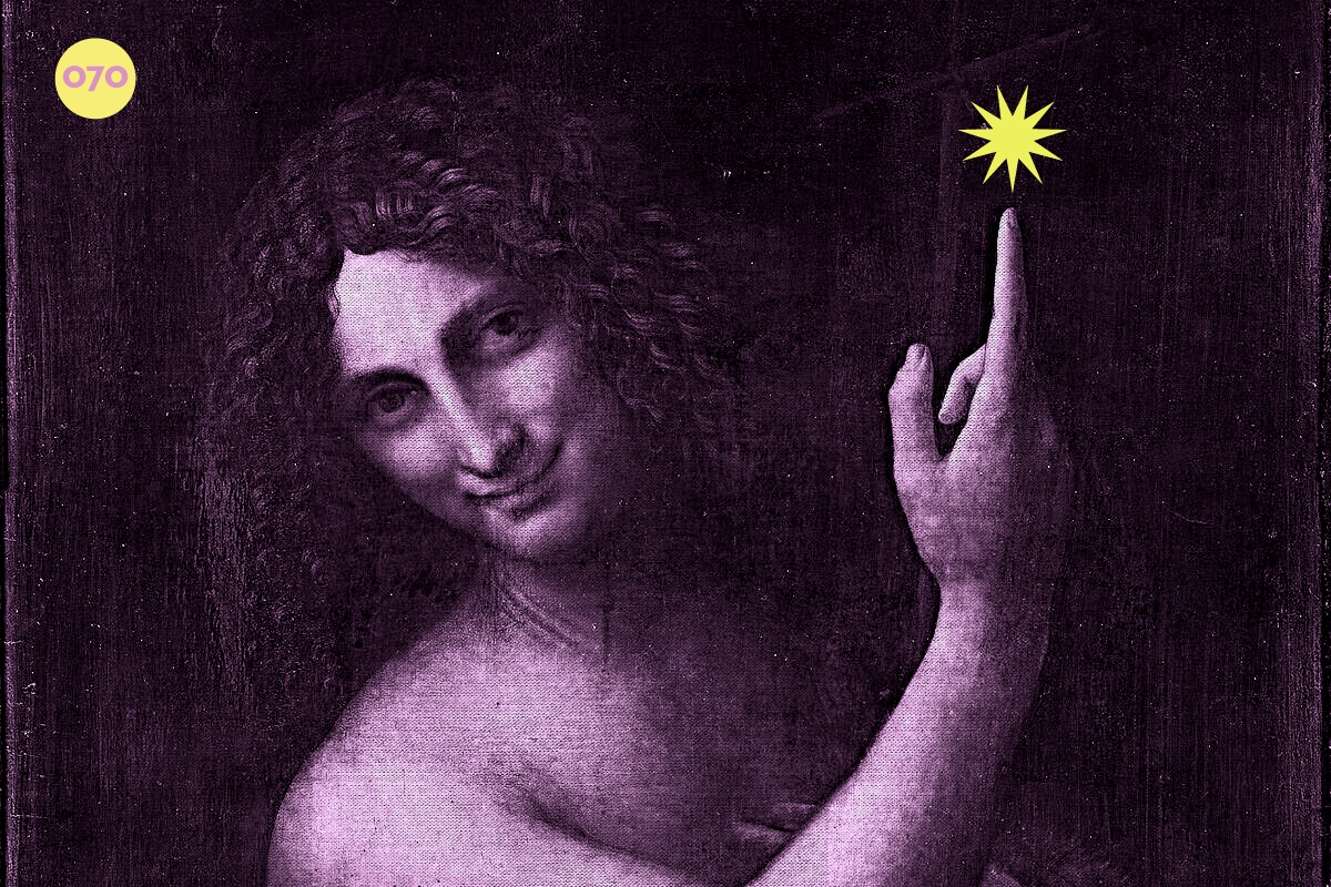 Pensé de inmediato en una de las obras tardías de Leonardo en la que aparece un San Juan Bautista malicioso y creído, con el índice derecho levantado, brazo cruzado en gesto protector, y los ojos diabólicos del que sabe algo que nosotros no sabemos. Que el único que sabe es el de arriba.