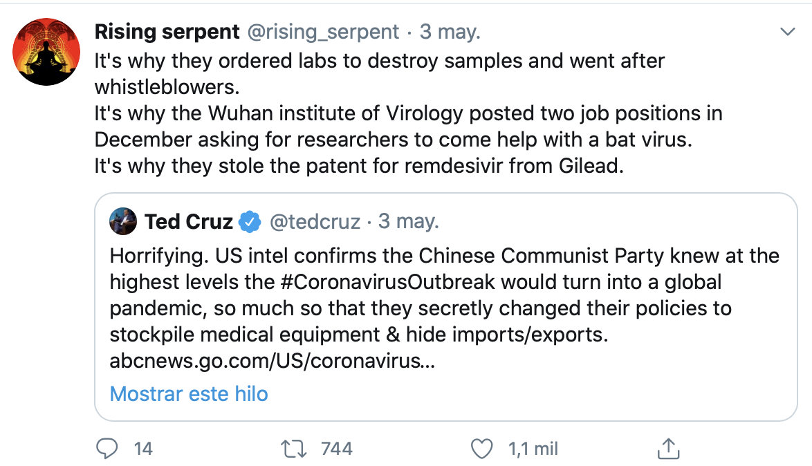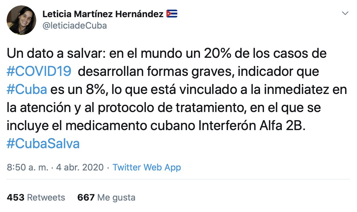Este énfasis con frecuencia se hace para promover posturas políticas, especialmente en Twitter. Tanto en Facebook como en Twitter, muchos de los posts que mencionan el interferón enaltecen a (o denigran de) el gobierno cubano y mencionan a figuras políticas de izquierda como Gustavo Petro y Nicolás maduro. El cubrimiento sobre hidroxicloroquina y azitromicina parece más informativo en Facebook, pero los tuits más retuiteados que mencionan a estos medicamentos tienen una carga política clara. Incluso algunos de los tuits sobre remdesivir tienen una inclinación política evidente.