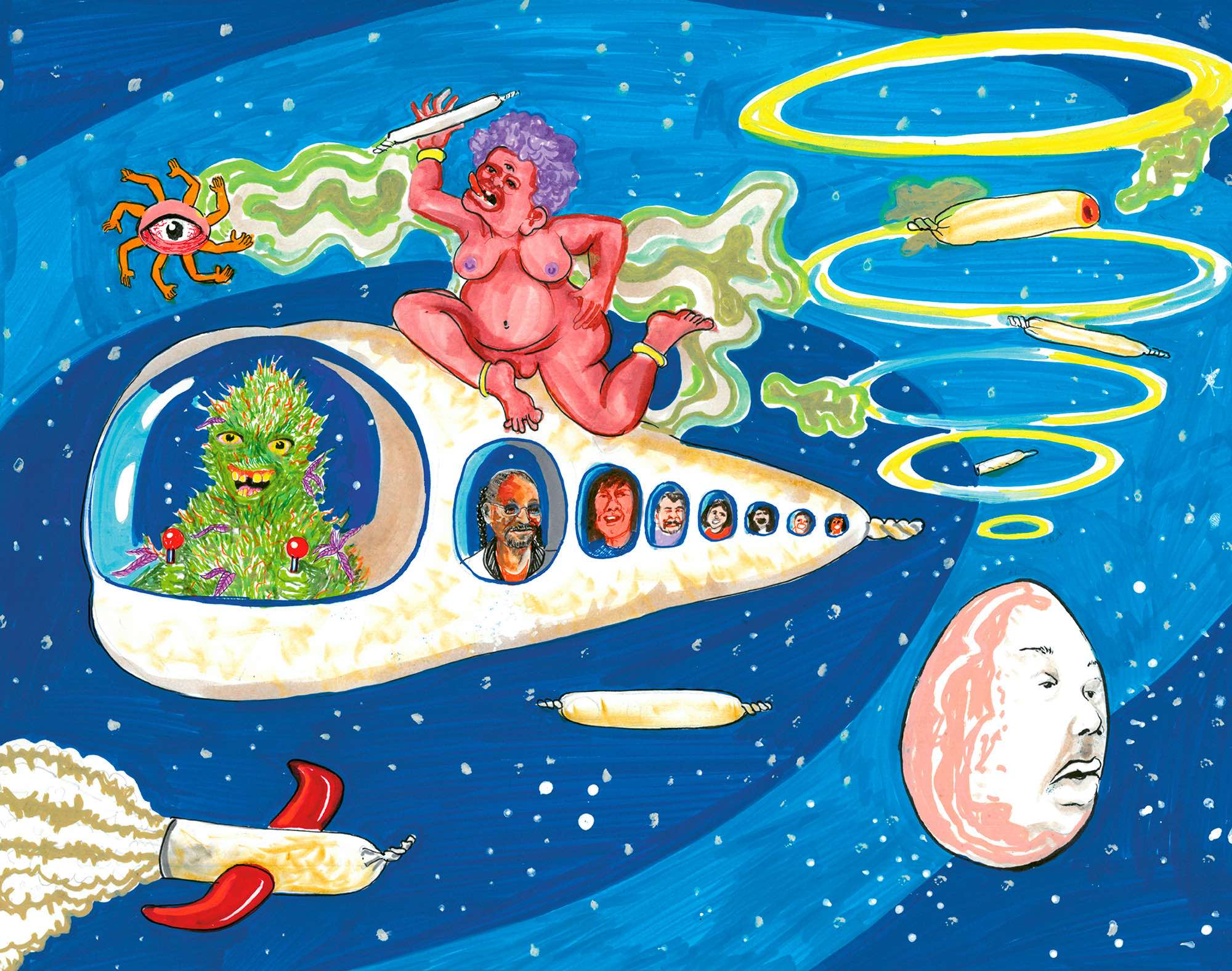 Portada: Porro intersideral, 2025, ilustración de Glenda Torrado, es una alegoría sobre los misterios de la marihuana. Se considera el «porro» como un vehículo de la imaginación y como elenco de tripulantes endocanabinoides.