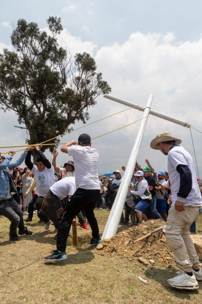 A pocos metros del árbol se levanta la cruz. Quienes están al lado reciben una cuerda para ayudar, y quienes no tienen cuerda graban con sus celulares.