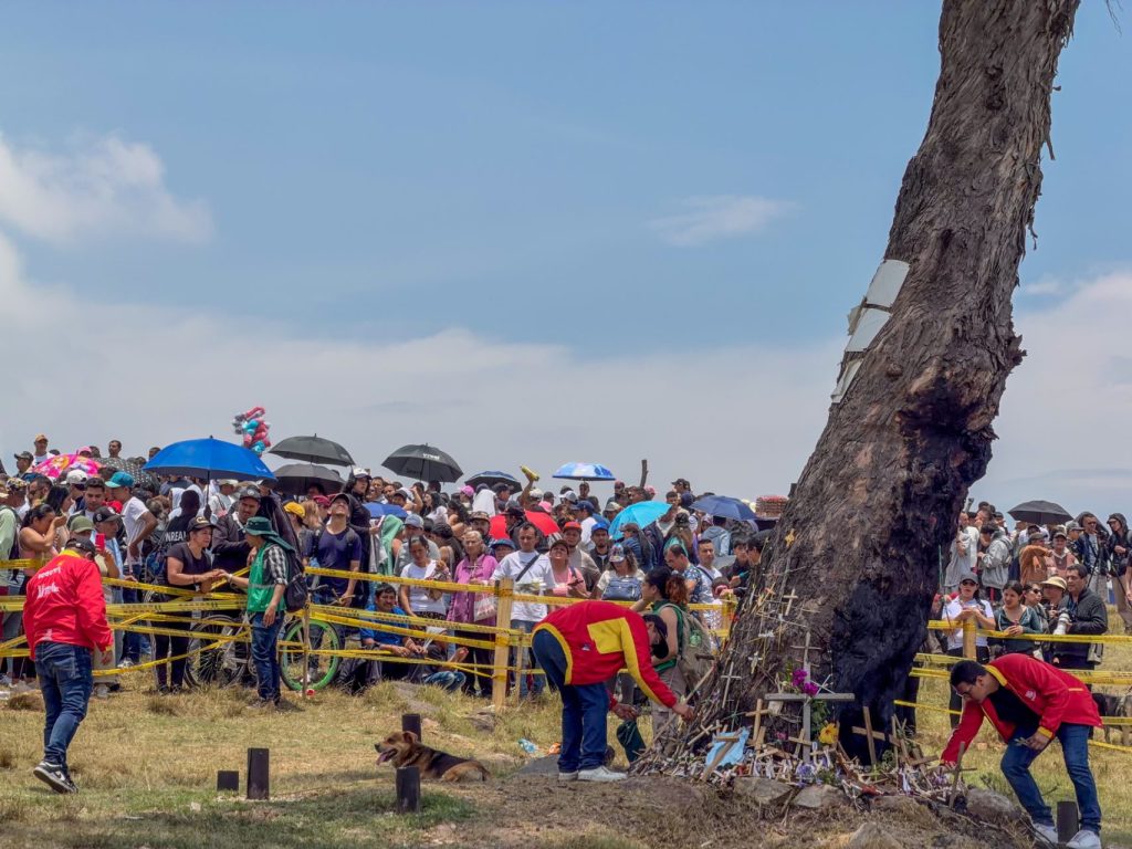 “Este año hay muchos periodistas”, dice y sonríe Miguel Niño, organizador del viacrucis hace 41 años. “Al árbol le han hecho tres atentados, pero ya lo declararon Bien de Interés Cultural. Sin embargo, el alcalde de la localidad me dijo que la compra del predio es un proceso entre el gobierno y personas particulares que es difícil”. El árbol se iza en el megalote “Las Azoteas”, avaluado en unos $80.000 millones de pesos, que tiene más de 300 hectáreas y le pertenece a Eduardo Romano y a su empresa, Grupo Malkenu. Los predios enfrentan procesos de extinción de dominio por presuntos vínculos con redes de “terreros” y figuras del narcotráfico, y la posesión del lote fue suspendida en 2025.