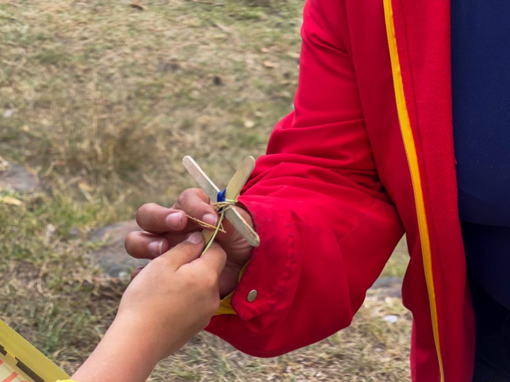La mano de un niño le entrega una cruz a un funcionario de la Alcaldía Local, quien la lleva al borde del árbol.