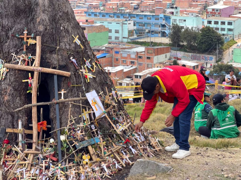 Jesus Vallejo, con su cabello completamente blanco bajo la gorra, parece recién llegado del campo. Está junto a la cruz. Le pregunto si es del barrio. “Llevo treinta y pucha de años”, dice con voz de quien arría una mula. Ciudad Bolívar, que empezó a hacerse a mano propia y sin planificación estatal previa, creció también como un árbol, desde la base hacia la altura. Cientos de personas como Vallejo llegaron acá escapando de la violencia sufrida en las zonas rurales del país, o con la esperanza de encontrar en la ciudad trabajos mejor pagados y una escuela más cercana para sus hijas e hijos. El barrio fue creciendo hacia los cerros, justo donde queda el árbol de la vida, antes conocido como árbol del ahorcado.