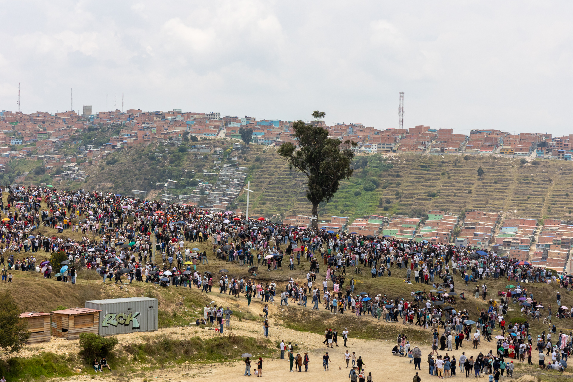 El sol se asoma a la distancia, sobre los cerros orientales, mientras en el otro extremo de Bogotá, junto a la parroquia Nuestra Señora de la Candelaria, las calles se colman de personas. En medio de locales y casas, familias enteras, con crucifijos, camándulas, sombrillas y gorras, se aglutinan. El suelo es todavía horizontal, pero justo hacia el suroriente se empiezan a empinar las calles. La cruz está en el piso todavía, y ocupa casi todo el carril de enfrente de la parroquia.