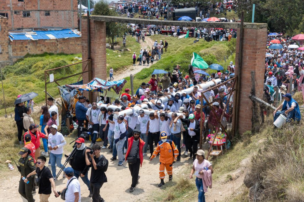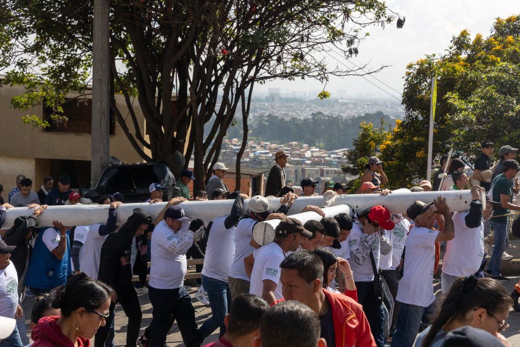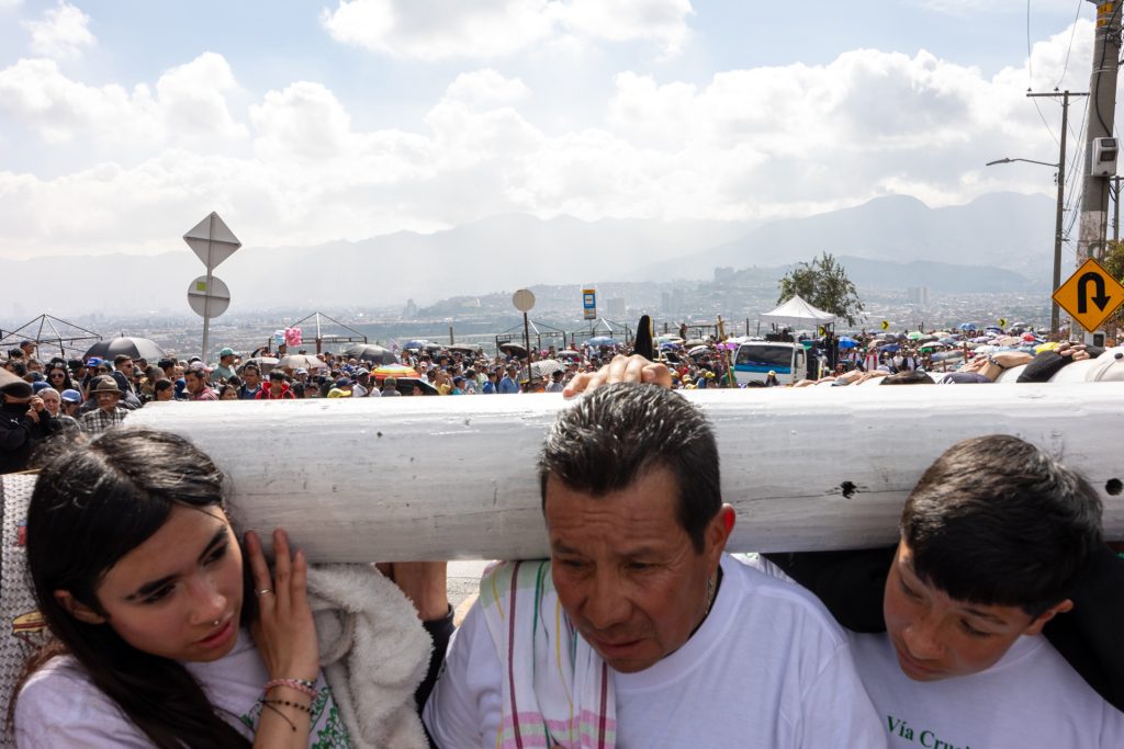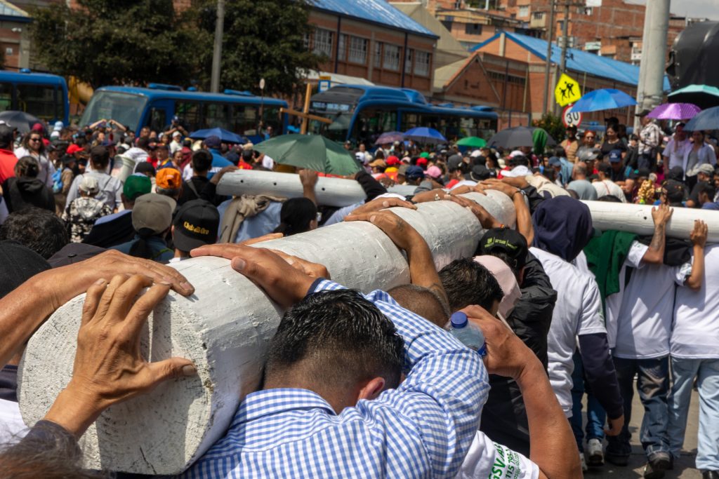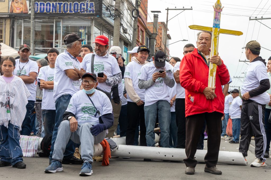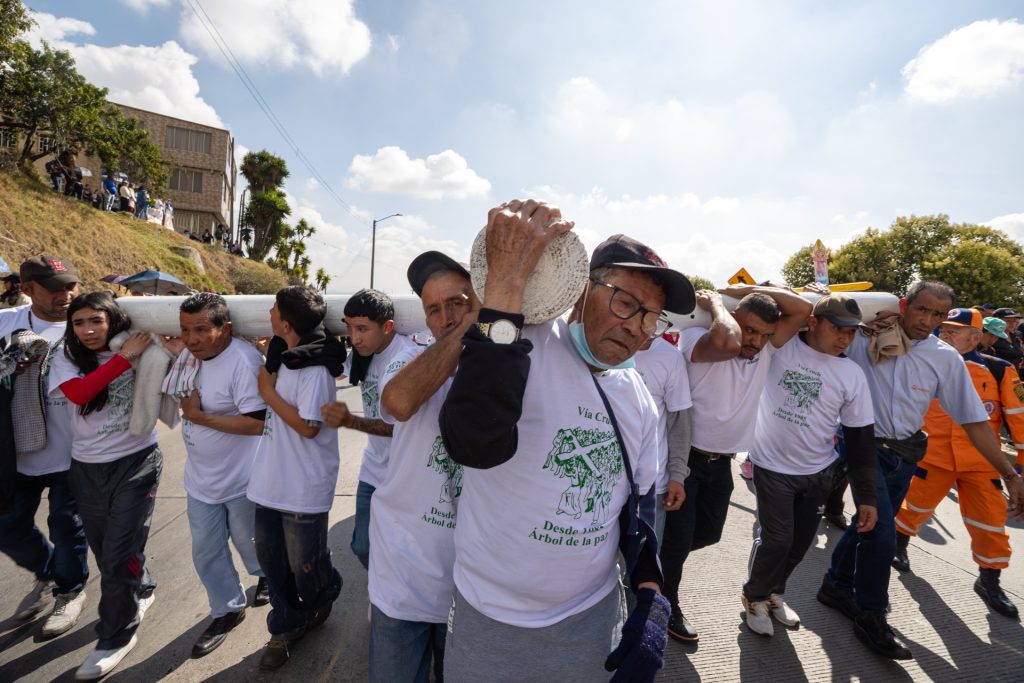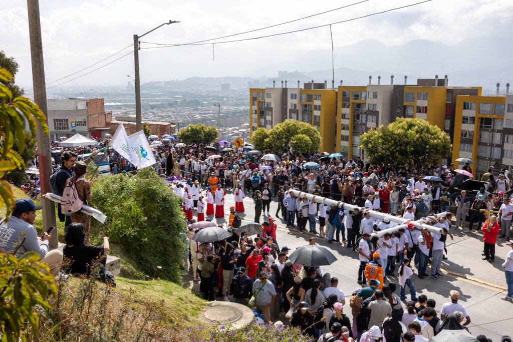 Tras quienes cargan la cruz va la multitud y Bogotá.