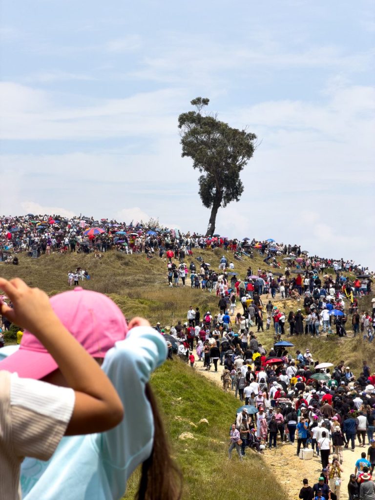 A medida que la cruz asciende, la gente que mira desde su cuadra se suma a la procesión. Llevan sombreros por el sol y ruanas por si acaso. Después de dos horas, Bogotá se va haciendo chiquita.
